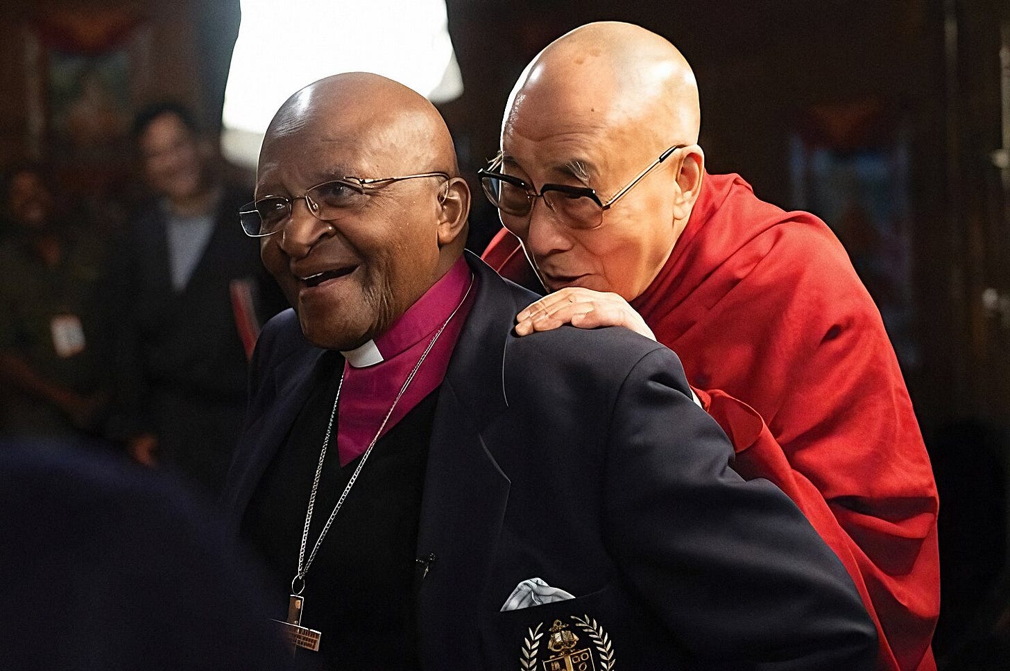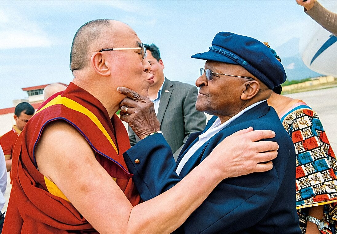 兩人一見面就立刻抱在一起,大主教為了更仔細端詳這個數年未見的老友,用手指端起達賴喇嘛的下巴,達賴喇嘛則噘起嘴作勢要親他,反而讓大主教真的湊過去親吻了達賴喇嘛的臉頰。