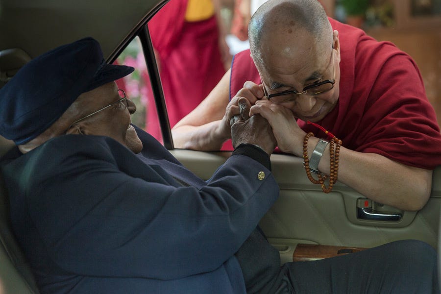 大主教坐在車裡,達賴喇嘛站在車外,兩人的手直到最後一刻都像是剛見面時一樣緊緊牽著。直到車隊啟動,達賴喇嘛站在原地揮手道別,而大主教也從車窗內回頭朝著達賴喇嘛微笑。