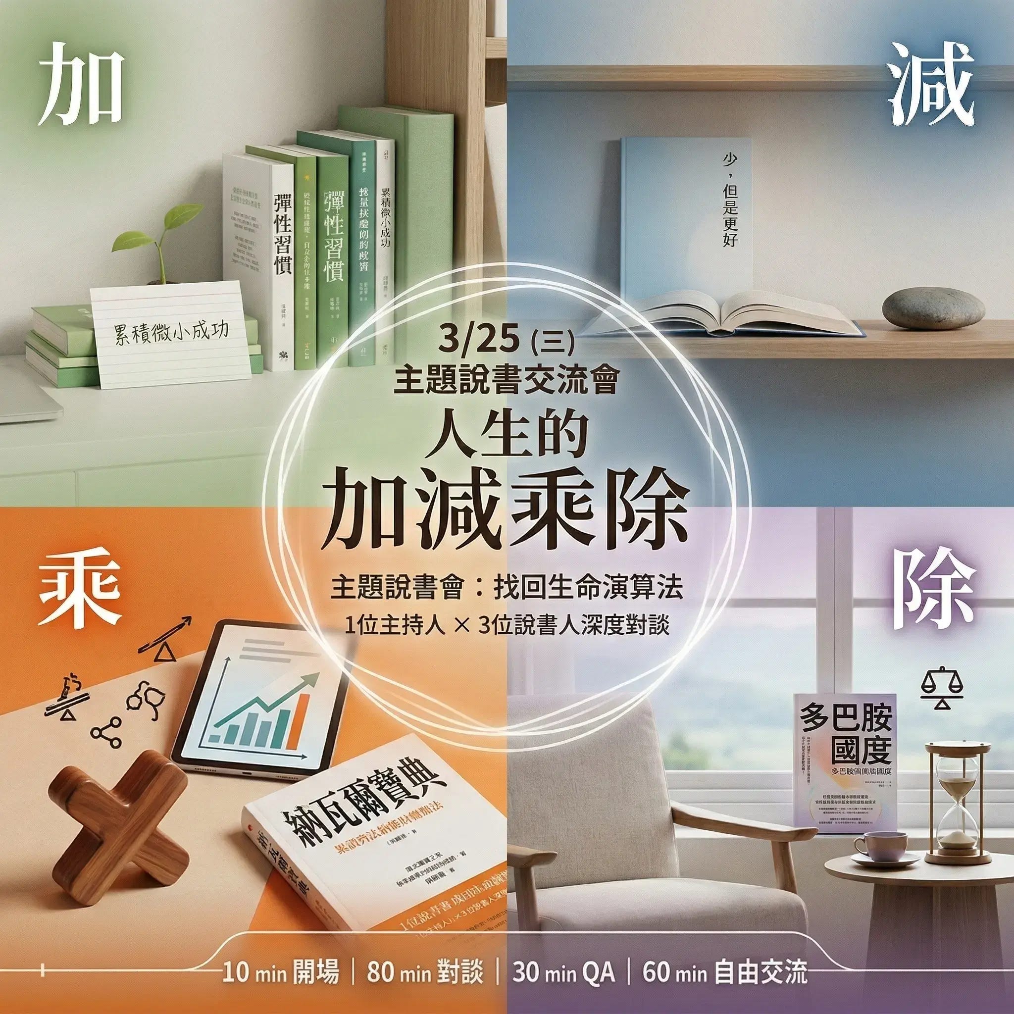 於是,我跟小實現 Derrick、有魚、白白四個大書蟲,決定合作舉辦一場讀書交流會,透過分享彼此壓箱底的「人生哲學書單」,與你分享我們是如何運用這四個簡單的數學運算符號,打造通往自我實現的道路。