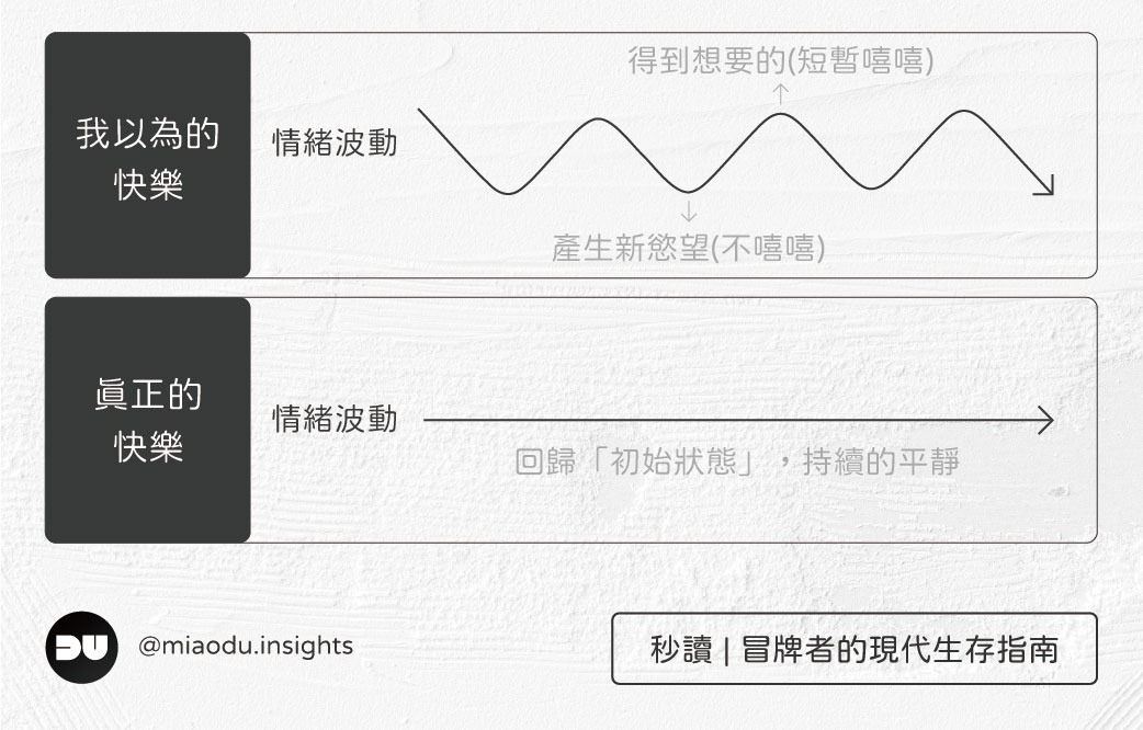 這就是為甚麼《納瓦爾寶典》中會提到,真正讓你感到幸福(Happiness)的終極方法,就是讓情緒回歸平靜。因為:
